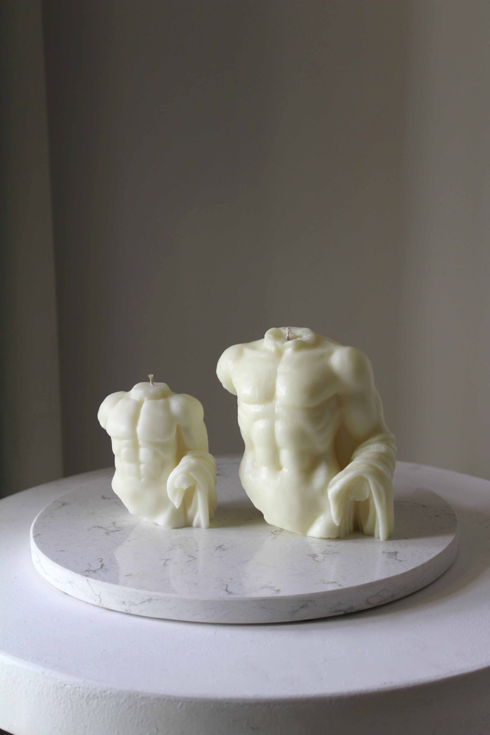 Apollo’s Torso is a sculptural candle inspired by classical statuary and the divine ideal of beauty. With defined musculature and a draped sash carved in wax, this headless figure pays homage to the Greek god of light, art, and poetry — captured in quiet strength.