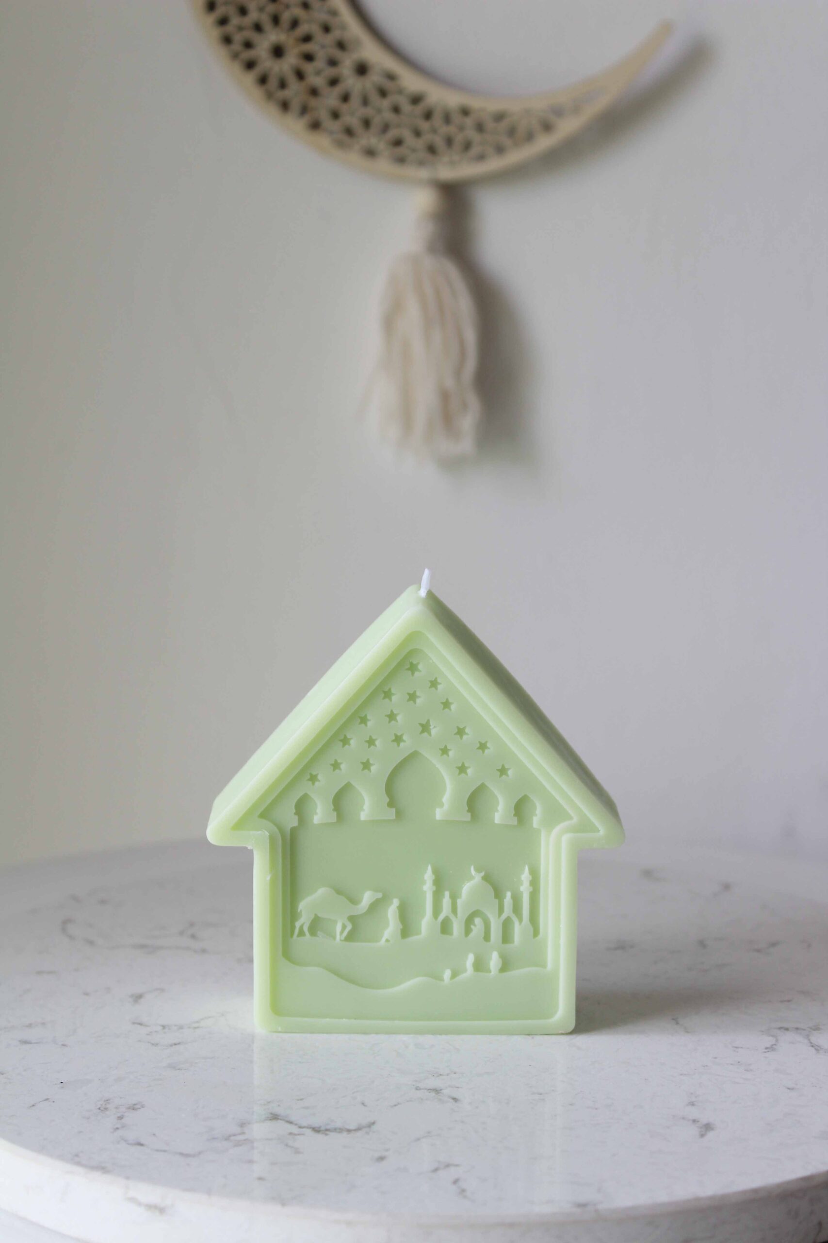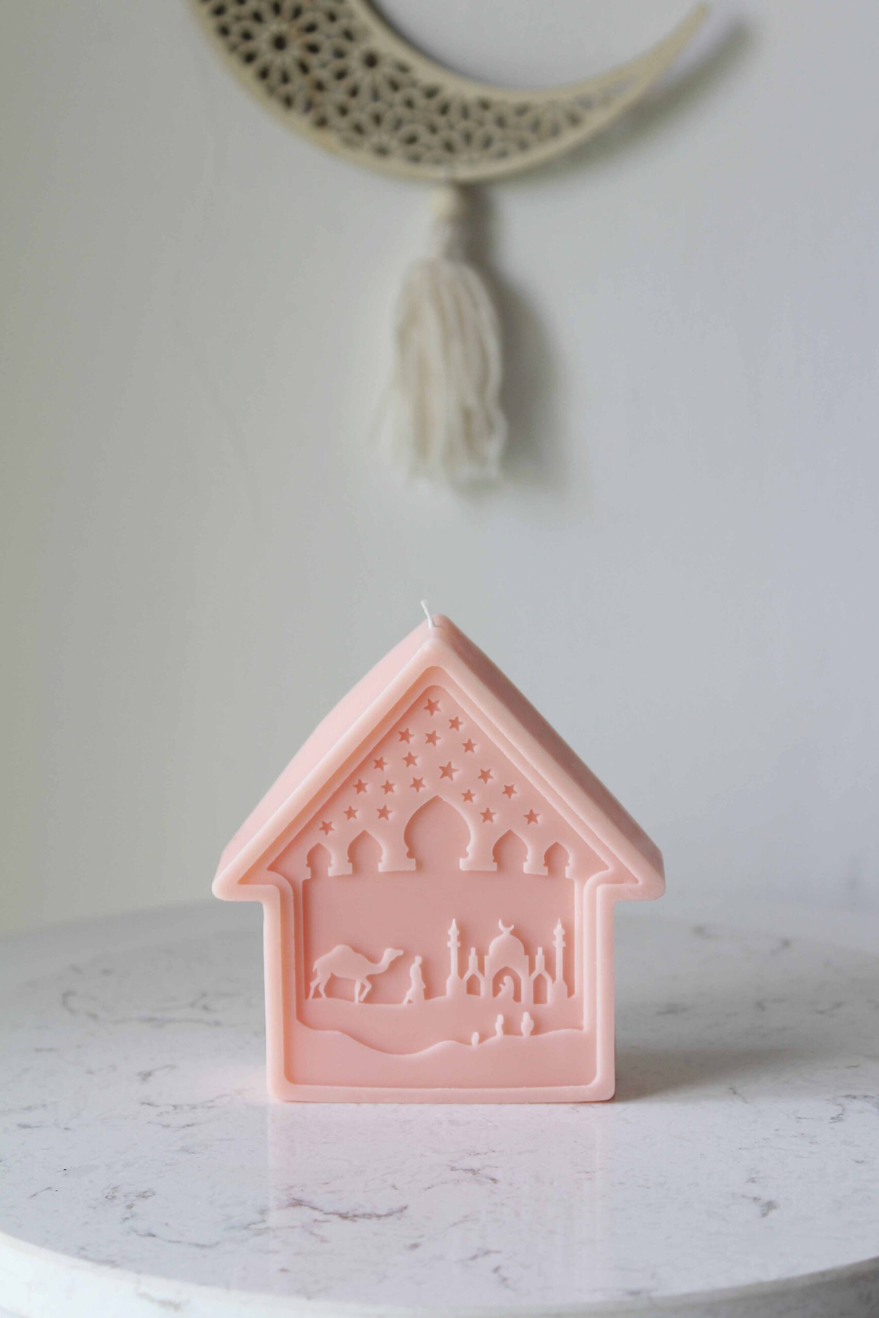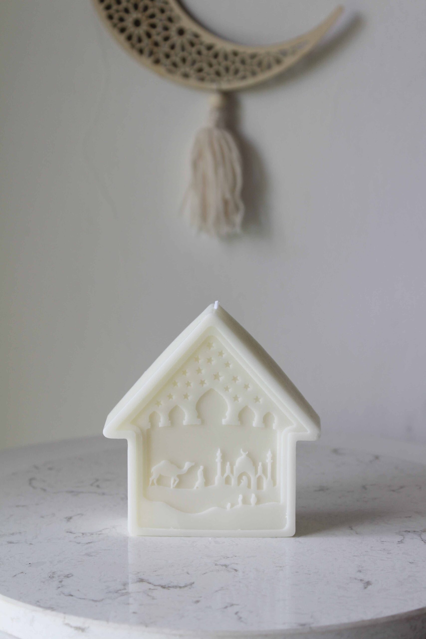 Framed in the silhouette of a house, this design captures a quiet journey through the dunes — where faith, tradition, and the beauty of Ramadan nights meet. The delicate scene of mosque, stars, and desert landscape creates a warm, nostalgic presence in your home.