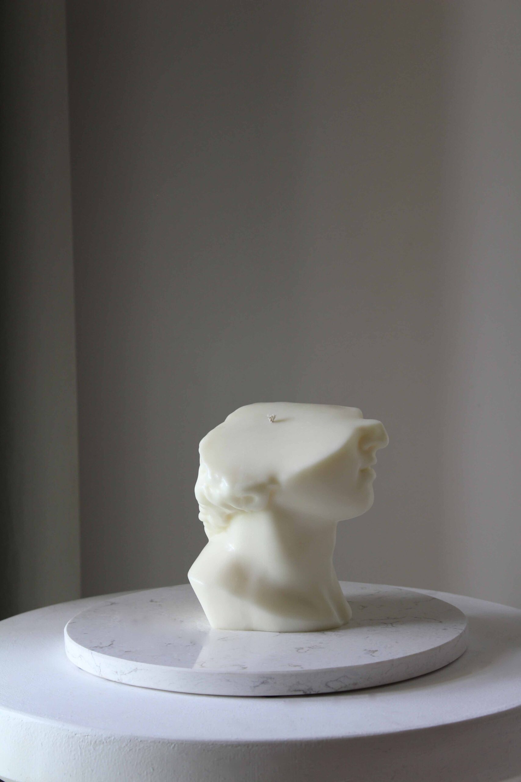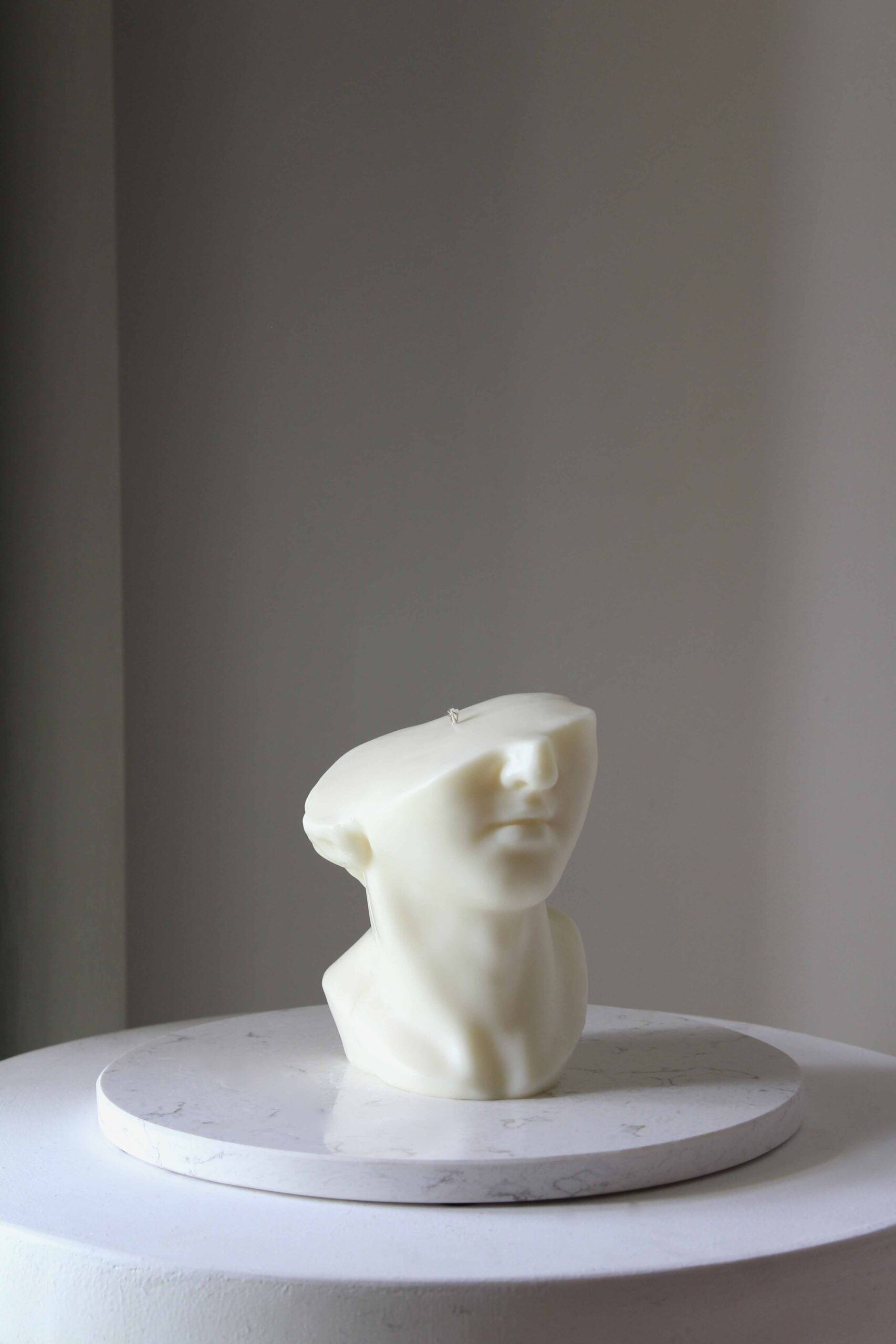 Lucas redefines the male bust — abstracted, softened, and quietly powerful. With half his face veiled in wax, he invites reflection: on identity, imperfection, and the beauty of what remains unseen.
