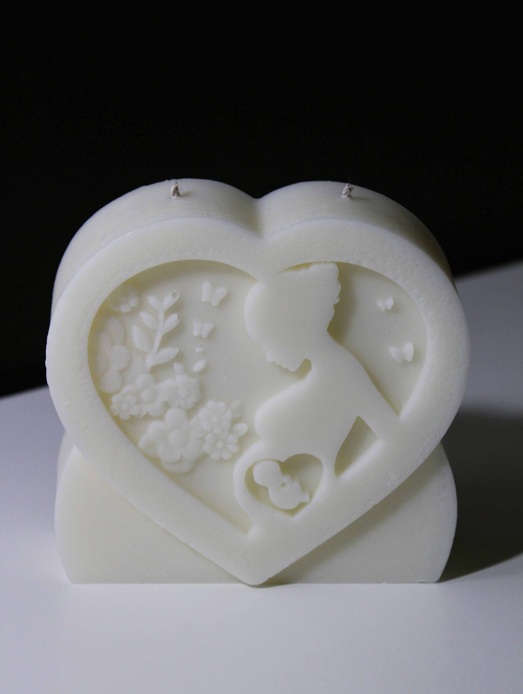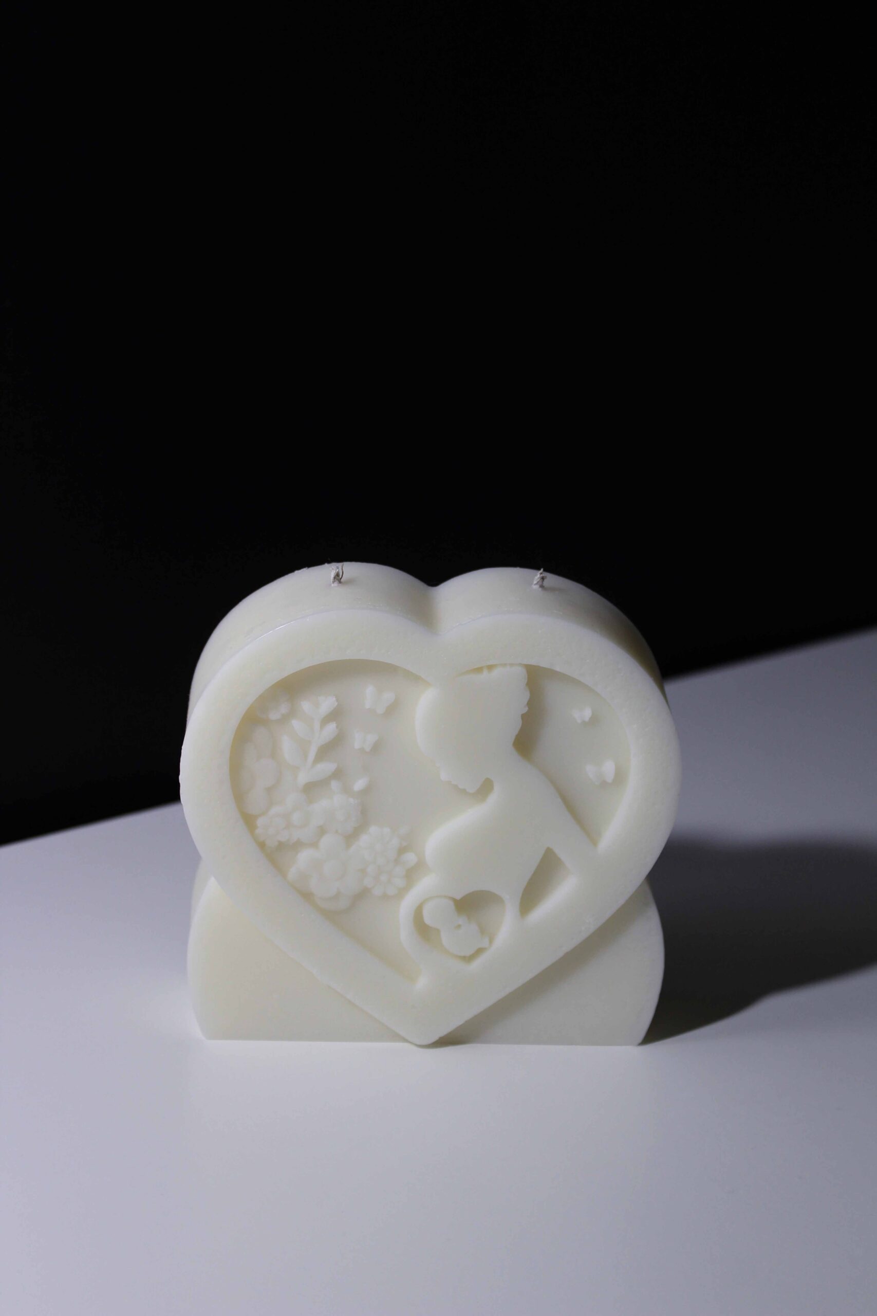 A candle that captures the quiet magic of motherhood — a heart-shaped frame cradling the silhouette of a mother, her hands resting gently over her growing child. Around her, delicate flowers and fluttering butterflies symbolize life, beauty, and transformation.