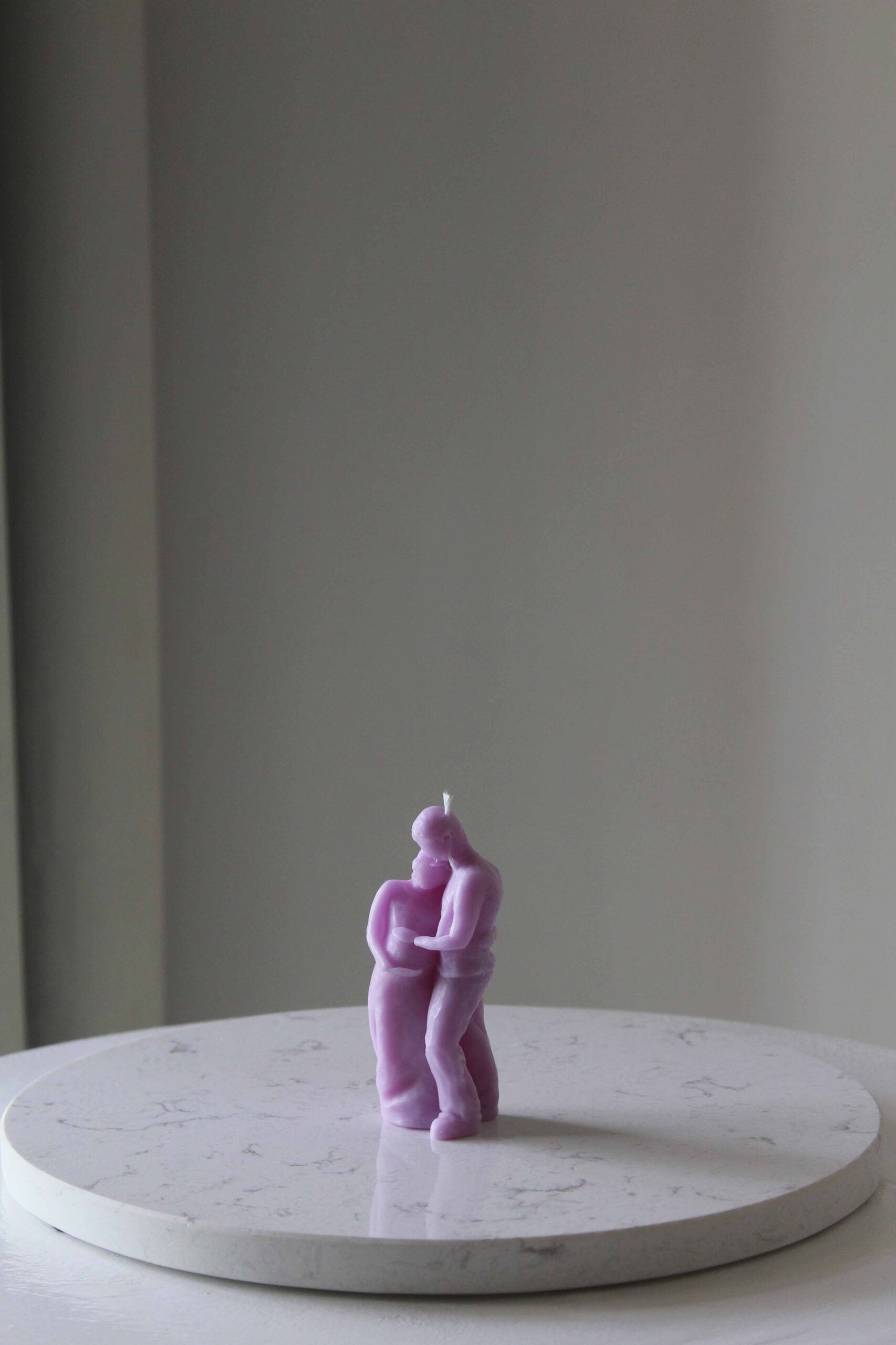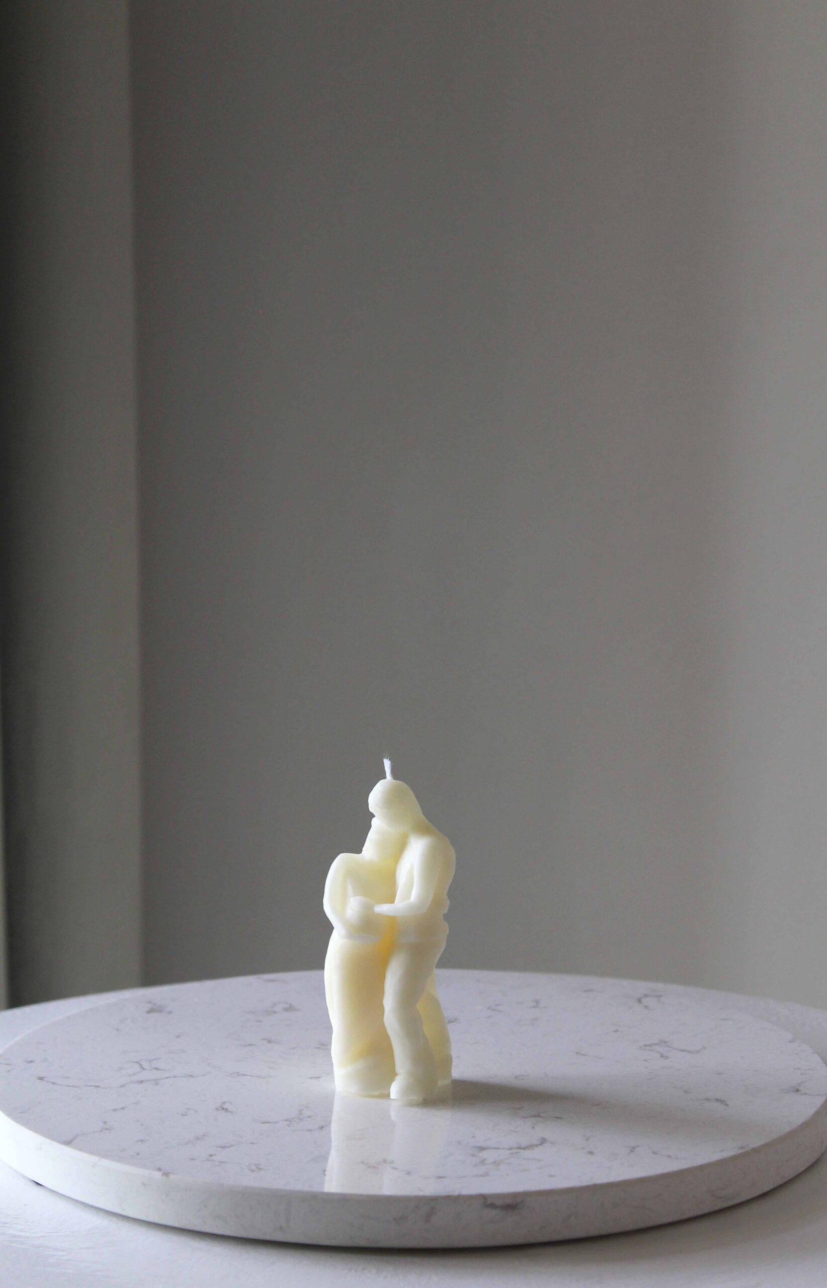 A touching sculptural candle that beautifully portrays the intimate bond of an expecting couple — the father leaning close, his arms wrapped with quiet strength, and the mother holding her growing belly with love and pride.
