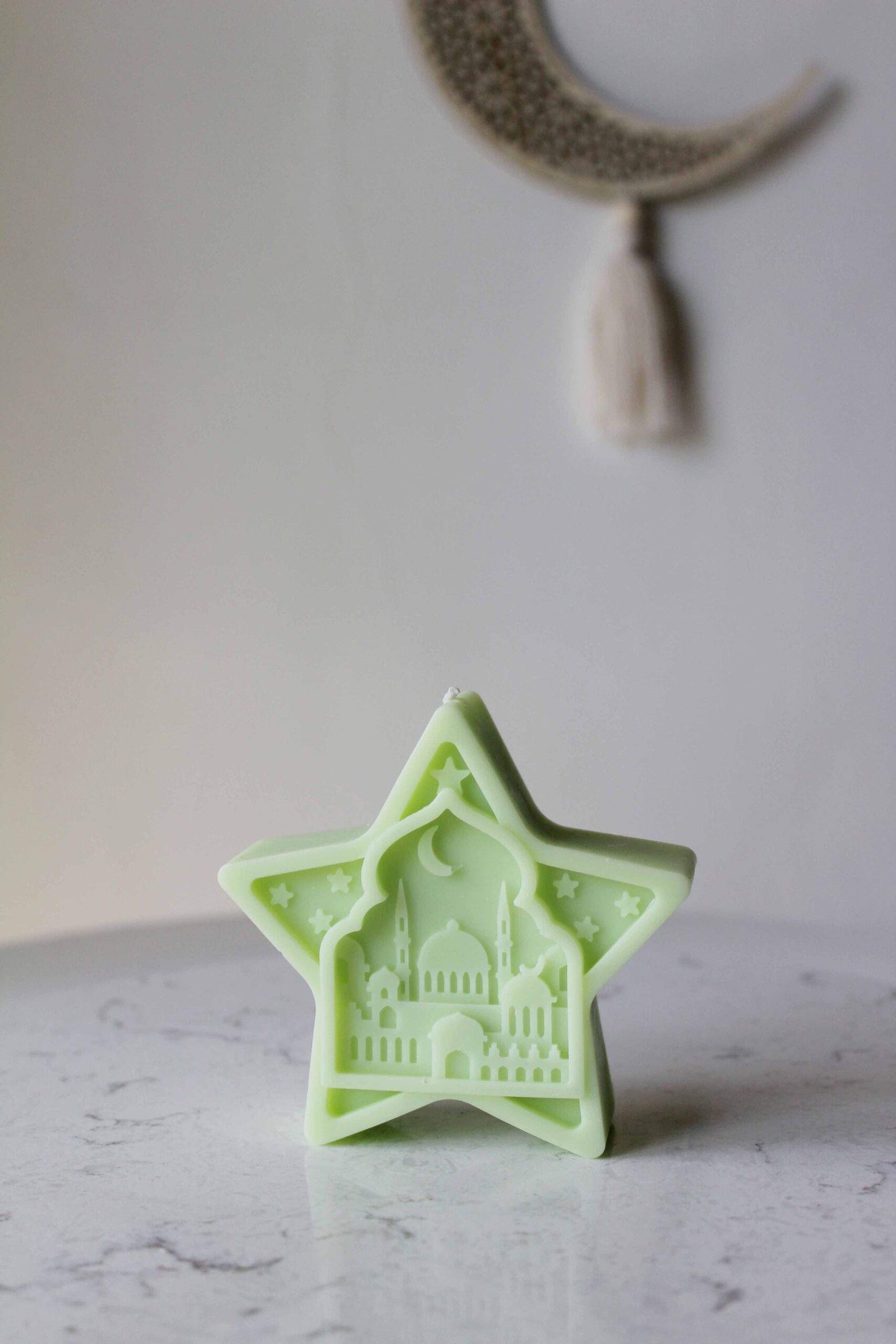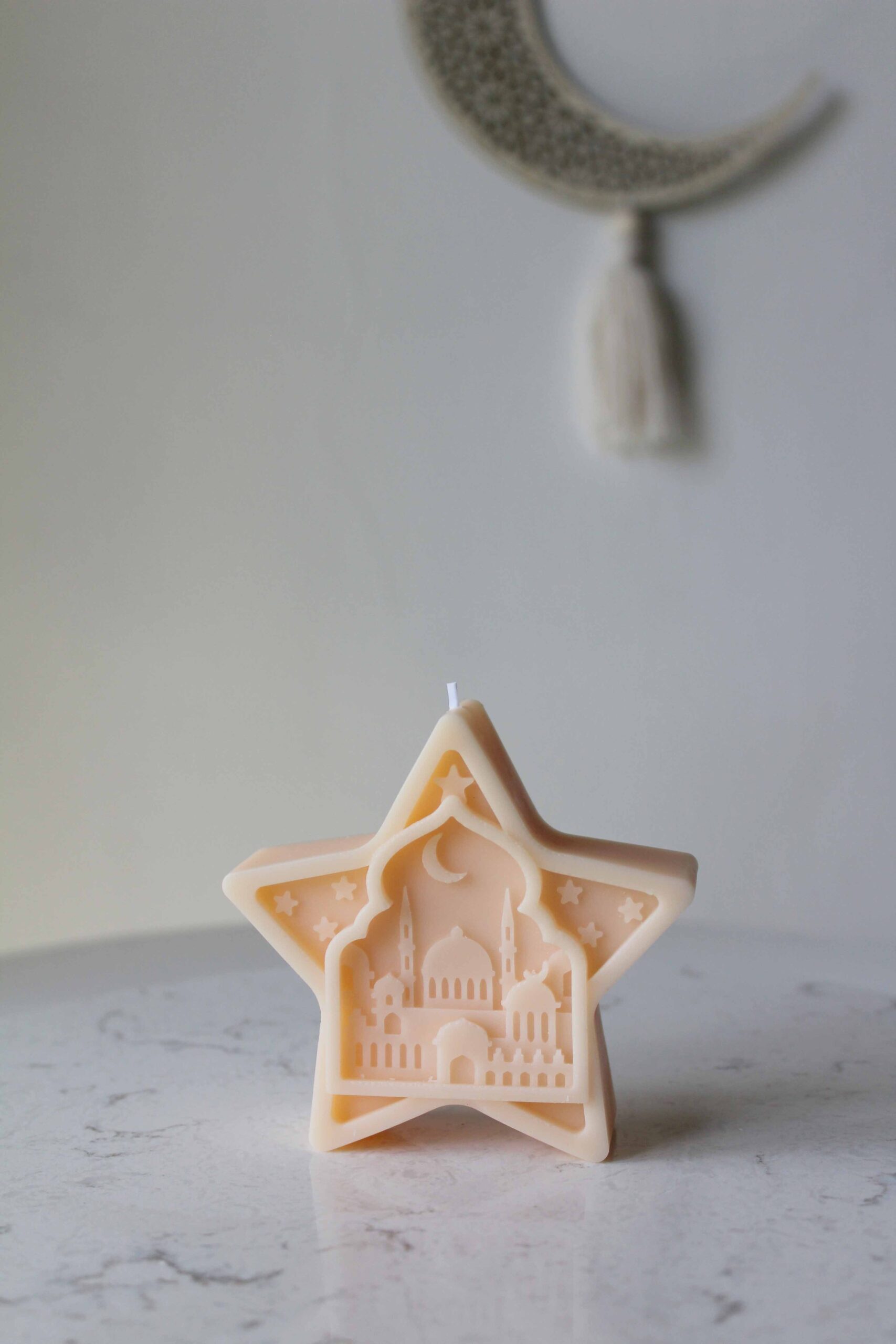 A sculptural candle inspired by the glow of sacred nights beneath a luminous crescent sky.