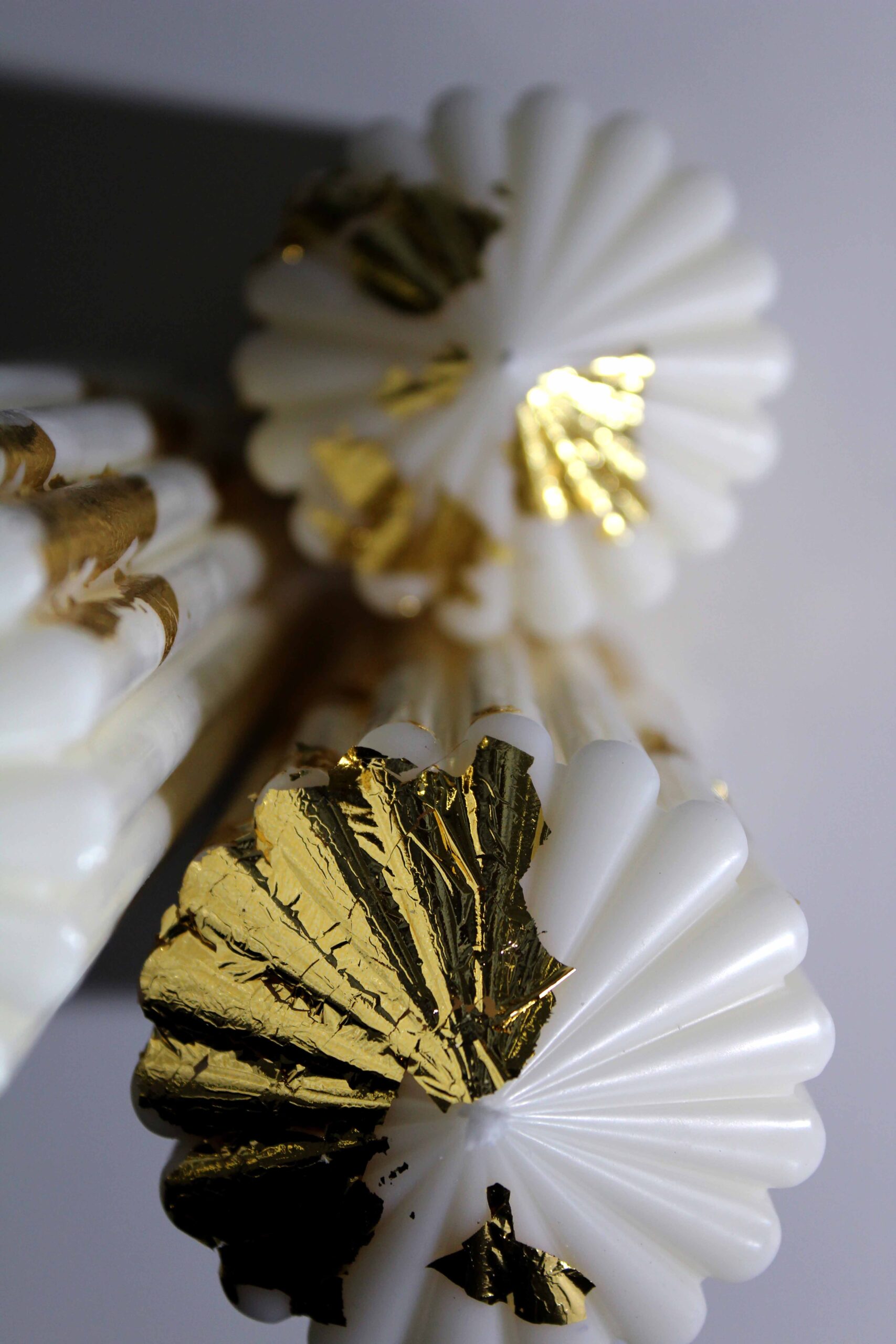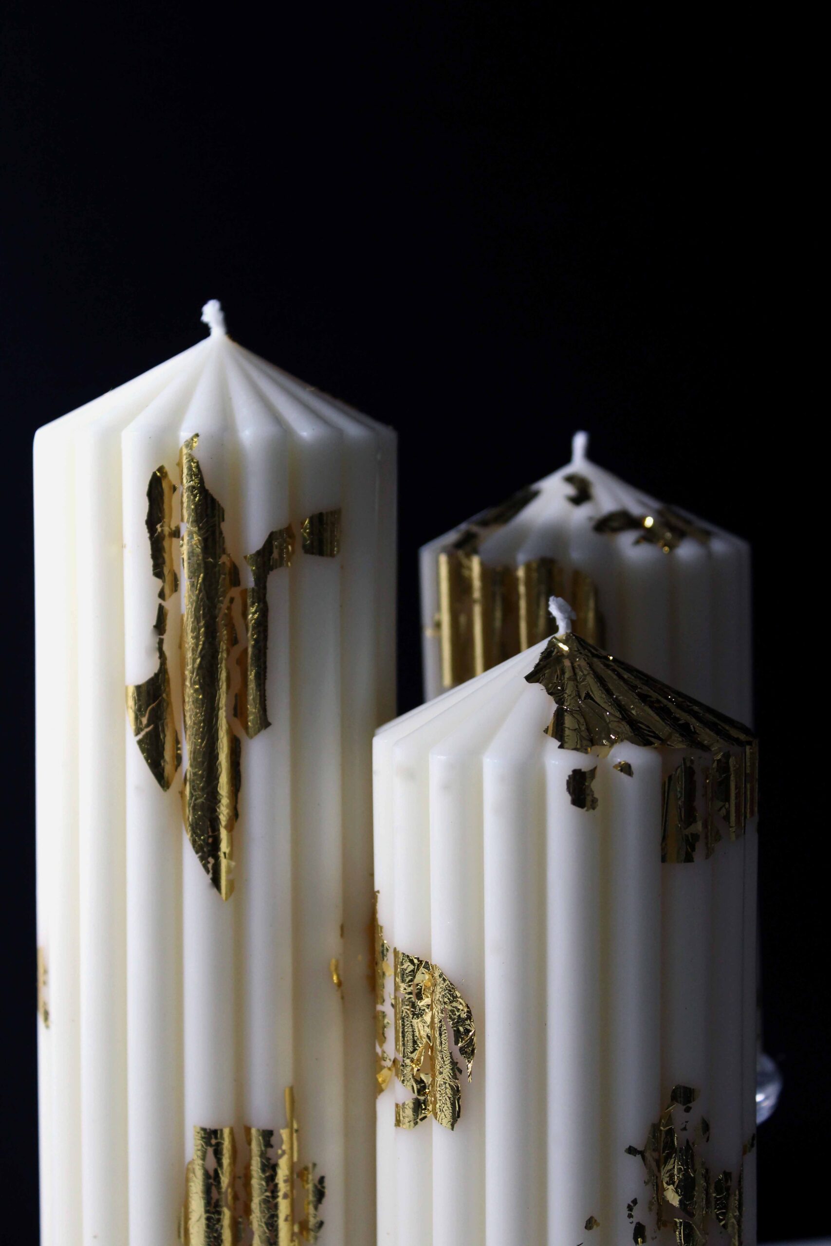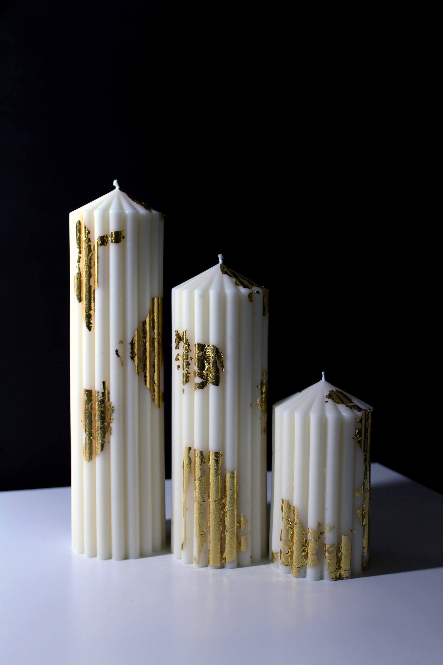 Solenne celebrates quiet luxury — where refined form meets luminous detail. Each candle is fluted like a column of light, delicately adorned with hand-applied gold leaf that catches every flicker of the flame. The irregular gilding makes each piece one of a kind, echoing the beauty of imperfection and artistry.